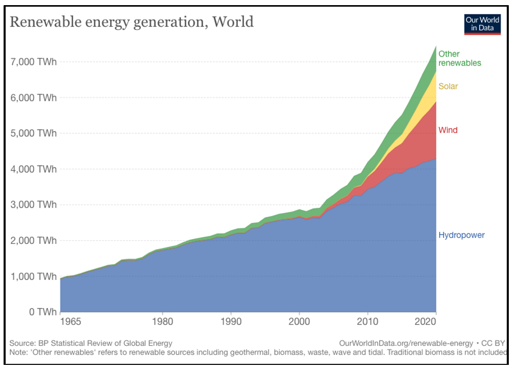 Uit figuur 2 blijkt dat de duurzame energieopwekking in de wereld maar gering is t.o.v. de fossiele opwekking uit figuur 1. Bovendien komt meer dan de helft daarvan uit waterkracht, hetgeen al een historisch gegeven is en alleen in landen plaatsvindt met een gunstige geologie.