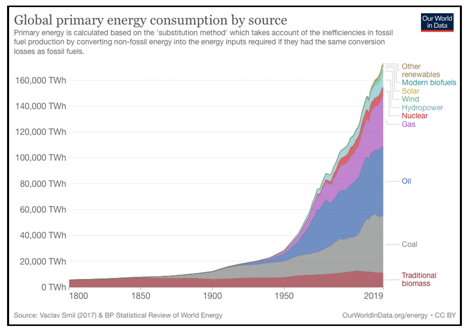 Het totale verbruik van kolen, olie en aardgas in de wereld is erg groot, en groeit nog steeds. O.a. China bouwt de komende jaren 600 kolencentrales.