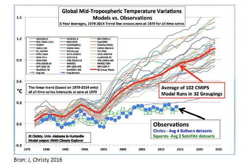 De computermodellen van het IPCC-rapport (Verenigde Naties) wijzen op een directe relatie tussen de CO2 toename in de atmosfeer en de temperatuurstijging. De fors toegenomen uitstoot van CO2 door menselijke activiteiten is in deze visie de oorzaak. Deze computervoorspelling worden niet bevestigd door de werkelijke metingen. Zie grafiek hieronder.